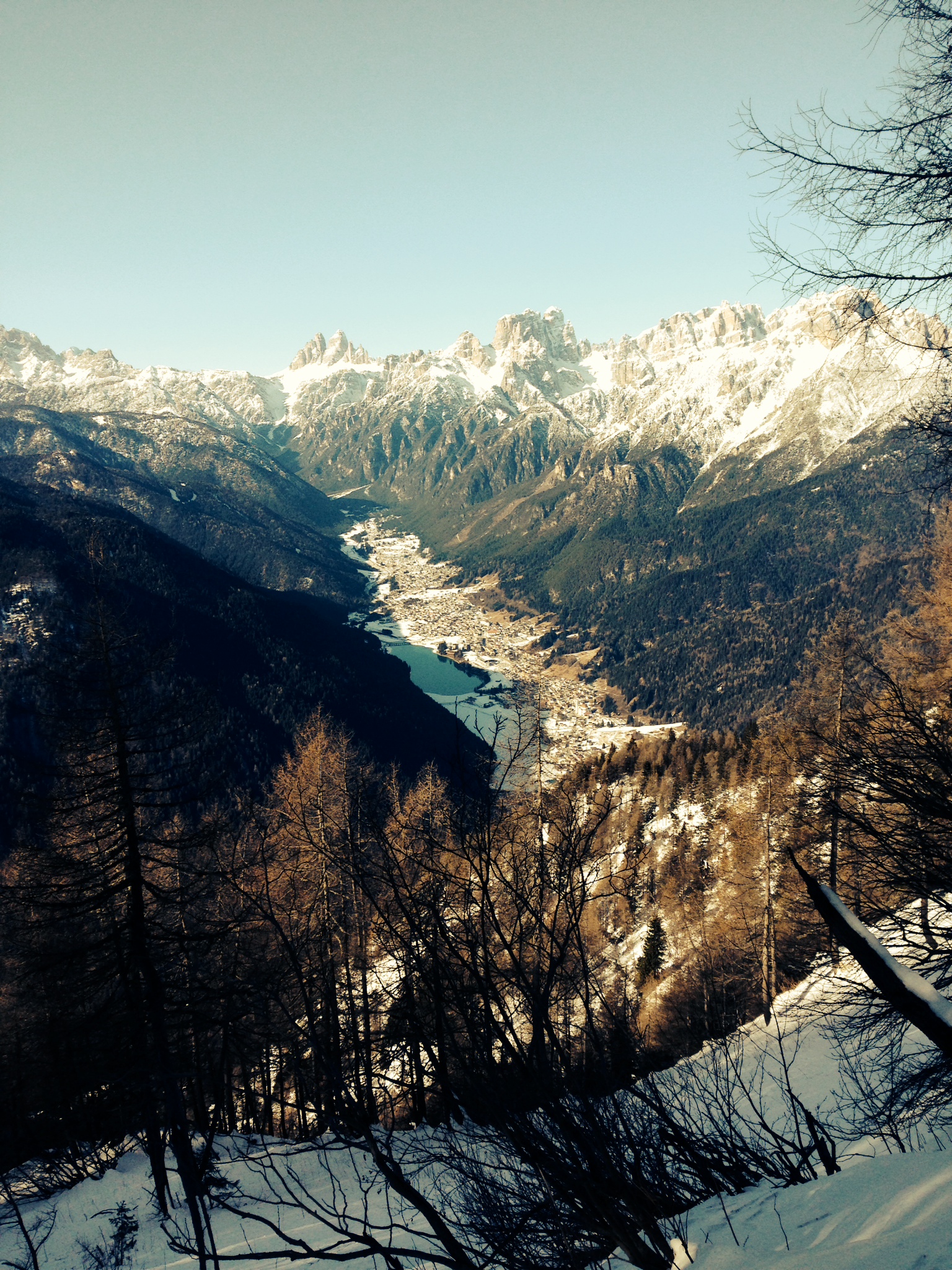Salendo ci si accorge che sui tornanti dispari si vede la val d’Ansiei con le tre cime di Lavaredo, i Cadini, Il M. Popera, La croda da campo, la croda dei toni, il paese di Auronzo e il Lago di Santa Caterina; e nei tornanti pari si vede la valle del Centro Cadore con il M. Montanel, il M. picco di roda, l’altopiano Pian dei buoi, l’imponente M. Antelao e tutti i paesi con il lago del centro Cadore. Quindi tutto il tragitto è un continuo repentino spostamento di attenzione dalla val d’Ansiei alla valle del Centro Cadore. Un confronto non poteva che venirmi naturale. I pensieri seguivano ciò che gli occhi vedevano; “ma che bella la val d’Ansiei”, “ma che spettacolo il M. Antelao”, “certo che i forti del M. Tudaio e i forti di col vidal (di fronte nel comune di Lozzo di Cadore) sembrano le colonne d’ercole”, “forse è più bella la val d’Ansiei, guarda il M. Popera che colosso ”, “no no, ho deciso è più bella la valle del Centro Cadore, gaurda giù in fondo si vede persino il M. Pelmo”, “certo che i Cadini fanno un bell’effetto però”. Otto km facendo pensieri sulle due valli, sul fatto che sono salito all’una e che forse la luce rende di più sulla valle d’Ansiei; si, ma se fossi restato fino al tramonto? La valle del Centro Cadore sarebbe un esplosioni di sfumature. Otto Km di fatica, con la neve fin sotto al ginocchio (25 gennaio) e con qualche timida slavina lungo la strada. Fatica, pensieri e piedi bagnati man mano che salgo sono quasi stufo di guardare le due valli….! Ma che ragionamento del cavolo stai facendo Davide, una volta che hai deciso il vincitore tra la val d’Ansiei e la valle di Centro Cadore cosa hai risolto? e soprattutto ma a chi gliene importa…! La stanchezza aumenta…d’inverno diventa davvero infinita questa strada. Mi sembra quasi che sia stata fatta volutamente così, lunga e ripetitiva per far capire che i confronti, i paragoni o campanilismi sono inutili come la r nelle marlboro. Lungo la strada potrete vedere le gallerie scavate nella roccia dallo stesso Genio militare (quanta fatica) e i forti. Il principale è in cima che insieme al panorama regala unicità a questo posto. Vi consiglio di portare una cartina per capire le montagne che vedrete…..perchè l’orizzonte da qui si sposta molto ma molto in là.