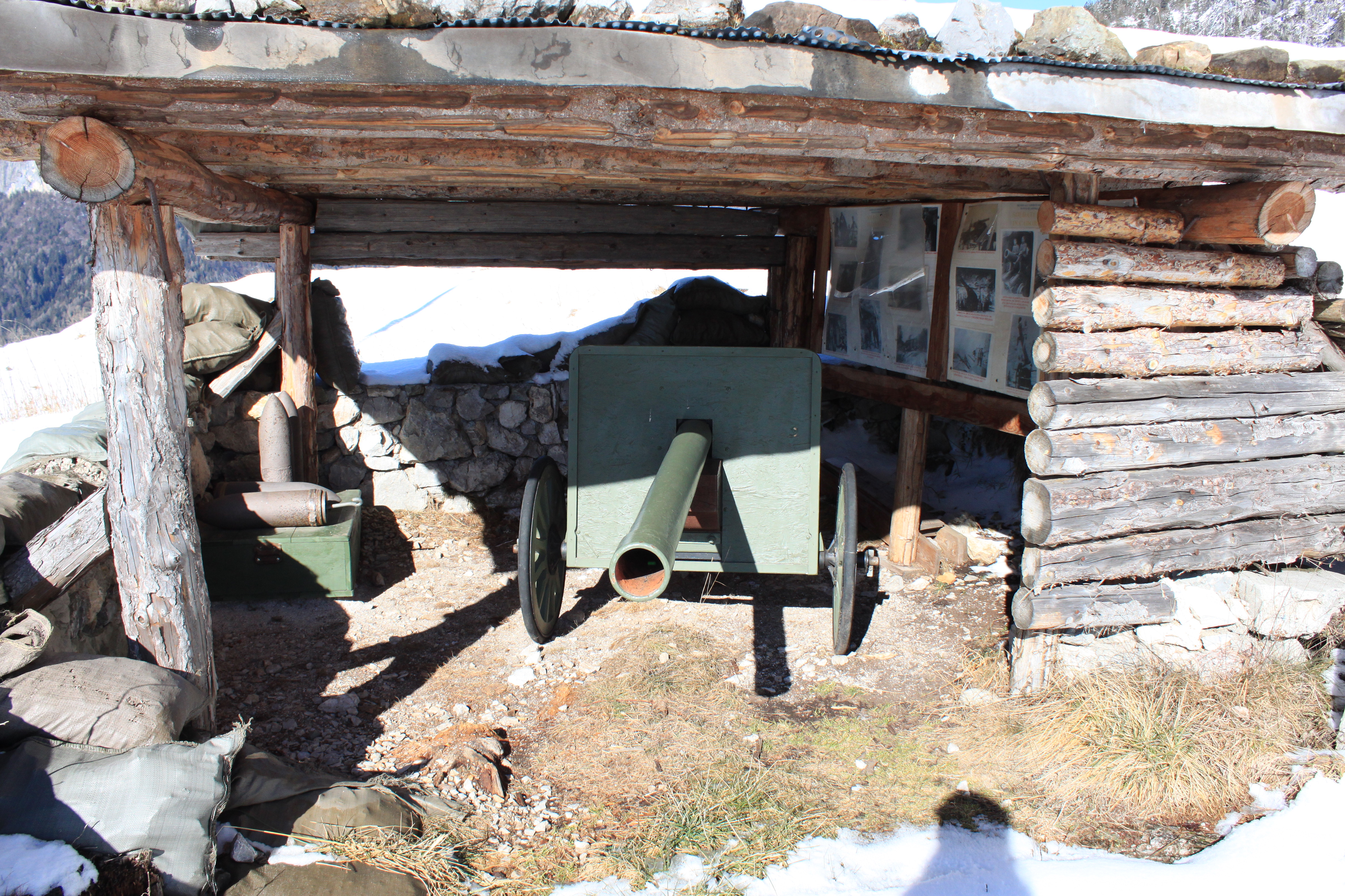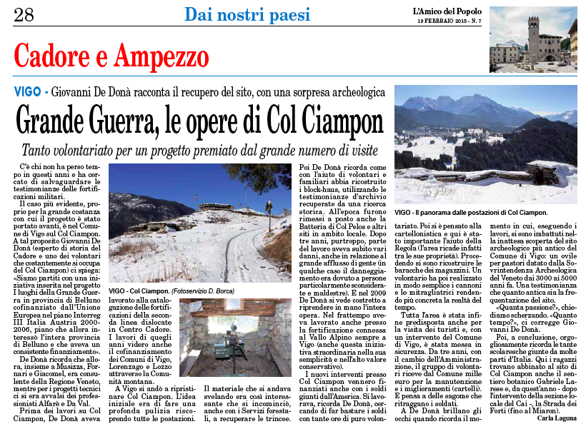 Dopo aver camminato per circa 1 km si giunge Col Ciampon, luogo in cui balzano immediatamente agli occhi delle postazioni di vedetta costruite prima della Grande Guerra. Tutto il sito è stato sistemato in un primo momento dai servizi forestali sulla base di un progetto interregionale, il lavoro è stato proseguito, poi, da Giovanni De Donà, suo figlio Giuseppe e Walter Musizza oltre che da un gruppo di bravissimi volontari di Laggio di Cadore che tuttora mantiene in ordine i luoghi.