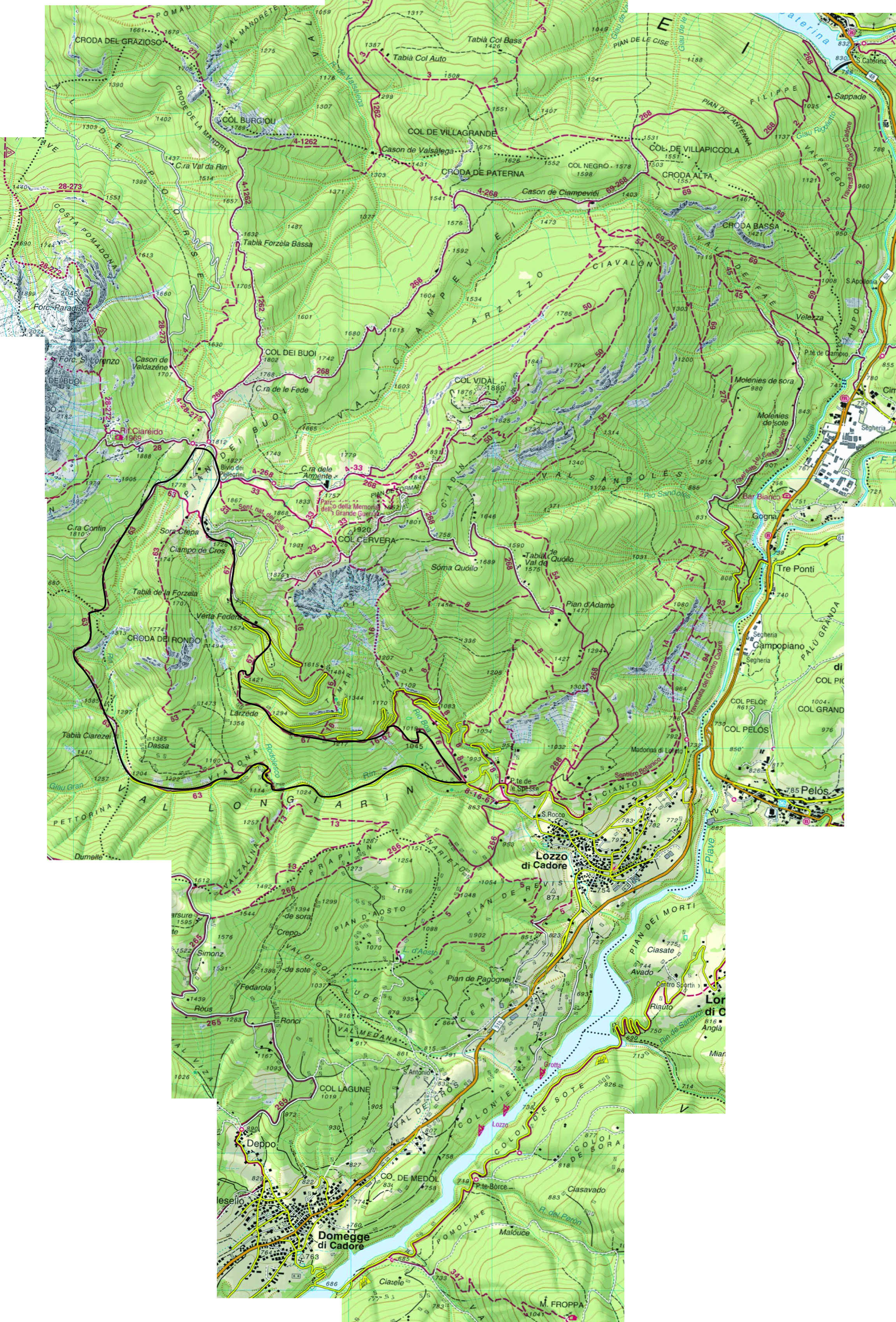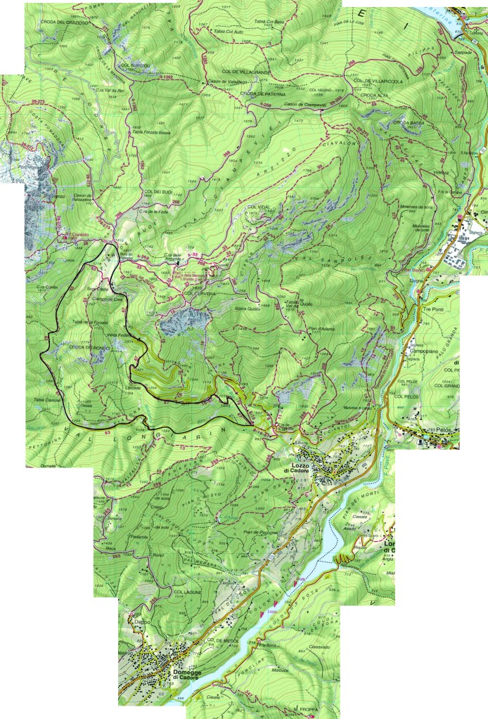 Esistono svariati sentieri che da Lozzo conducono a Pian dei Buoi, ma alcuni fra questi sono da considerare dei “gran classici”; non è semplice trasmettere questa sensazione ma è un po’ come il circuito del Mugello per la Motogp oppure la Streif per la discesa libera. L’itinerario che oggi si consiglia permette di percorrere due fra questi sentieri, il n. 63 per salire e il n. 67 per scendere. Si parte da sopra il paese, all’incrocio tra la strada del Genio che porta a Pian dei Buoi e la strada che porta in Val Longiarin, la presenza di numerosi spiazzi consente di parcheggiare comodamente la macchina. La prima parte del cammino verso Val Longiarin si svolge su una strada larga, a tratti asfaltata ed a tratti sterrata, costeggiata dal Rio Rin (il torrente che alimenta i mulini), il cui dolce fluire permette di inoltrarsi lentamente nel bosco cullati dal suo scroscio. Dopo appena un centinaio di metri di cammino si deve attraversare un ponte nel punto in cui il Rio Rin si unisce con un altro torrente, il Rodolesco. Proseguendo lungo la strada ci sarebbe la possibilità, facendo una piccola deviazione di circa dieci minuti, di ammirare la cascata del Rodolesco – anzi, è consigliabile organizzare un’apposita gita per vederla dal momento che la nostra escursione è ancora molto lunga e la fretta non permetterebbe di ammirarla come merita . Proseguendo lungo la strada asfaltata si trova sulla destra il segnavia n°63, ma si consiglia di imboccare l’anello più avanti (vedi cartina); la strada si trasforma a poco a poco in sentiero ed ecco che inizia la salita vera e propria, la pendenza, che rimarrà più o meno costante, permette immediatamente di capire che questa escursione impegnerà parecchio le nostre gambe. Camminando tra corsi d’acqua, grotte e qualche “barànčo” si giunge infine all’agognata meta: la strada sterrata di Pian dei Buoi dove si può considerare terminata la grande fatica. Da questo punto in avanti si può rilassare le membra e dedicarsi esclusivamente alle emozioni che si provano ammirando il panorama mozzafiato di cui si gode da uno tra i più begli altopiani dolomitici e all’esaltazione dei sensi tra i mille colori e profumi che mutano in ogni stagione. Giunti a questo punto, se le forze non sono ancora esaurite, allungando l’escursione c’è la possibilità di raggiungere i due rifugi Ciareido e Bajon, magari per rifocillarsi dopo la scarpinata, gustare un pranzo in compagnia e imboccare la discesa sazi delle ottime zuppe di Dino o del formidabile goulash di Enzo. Proseguendo lungo la strada del Genio in direzione Lozzo si raggiunge la caserma di Soracrepa e poco più avanti si imbocca sulla destra il Gran classico per eccellenza, il sentiero n°67 che in pochi km di ripida discesa vi porterà nel luogo dove avete lasciato l’automobile.