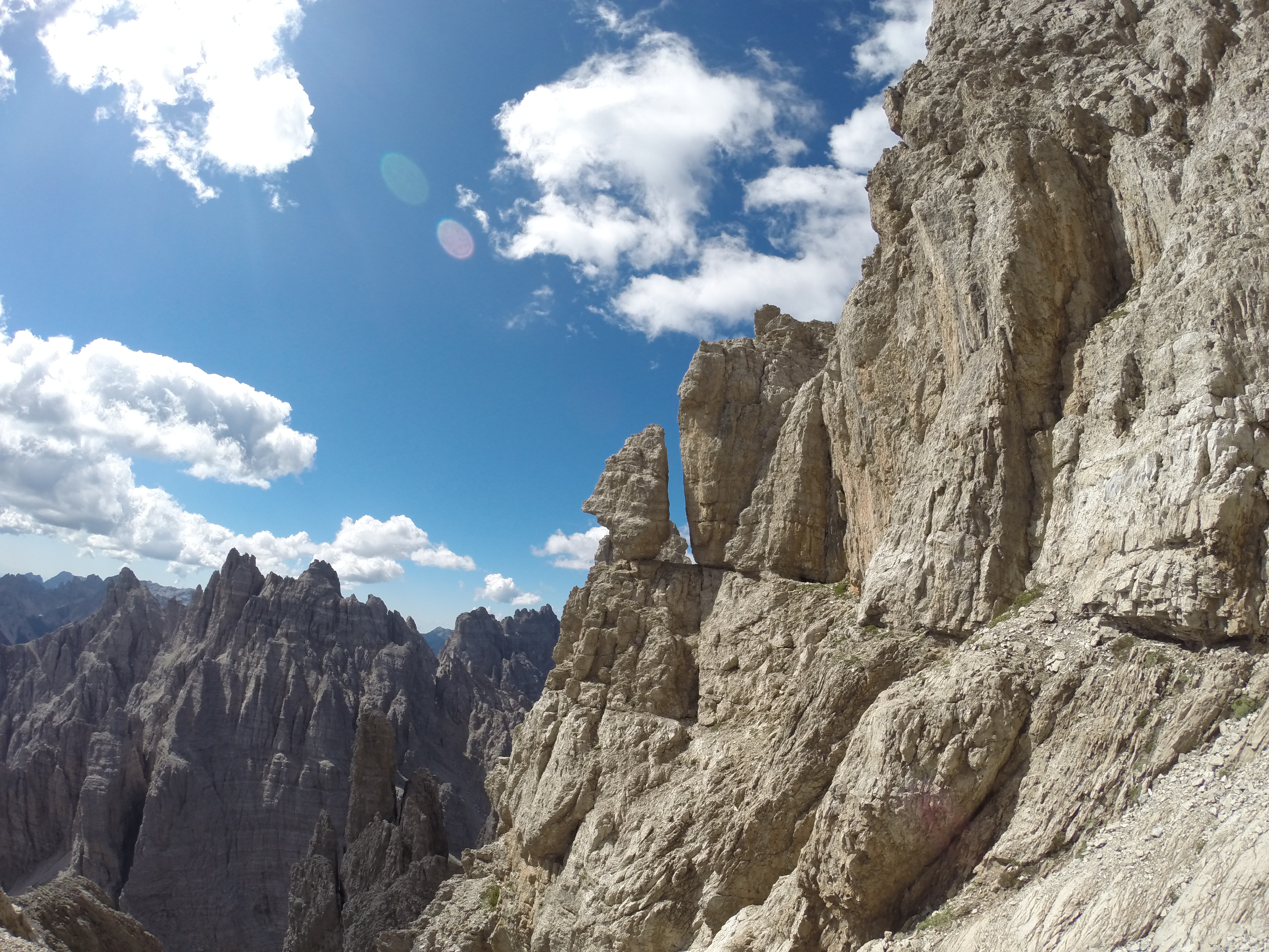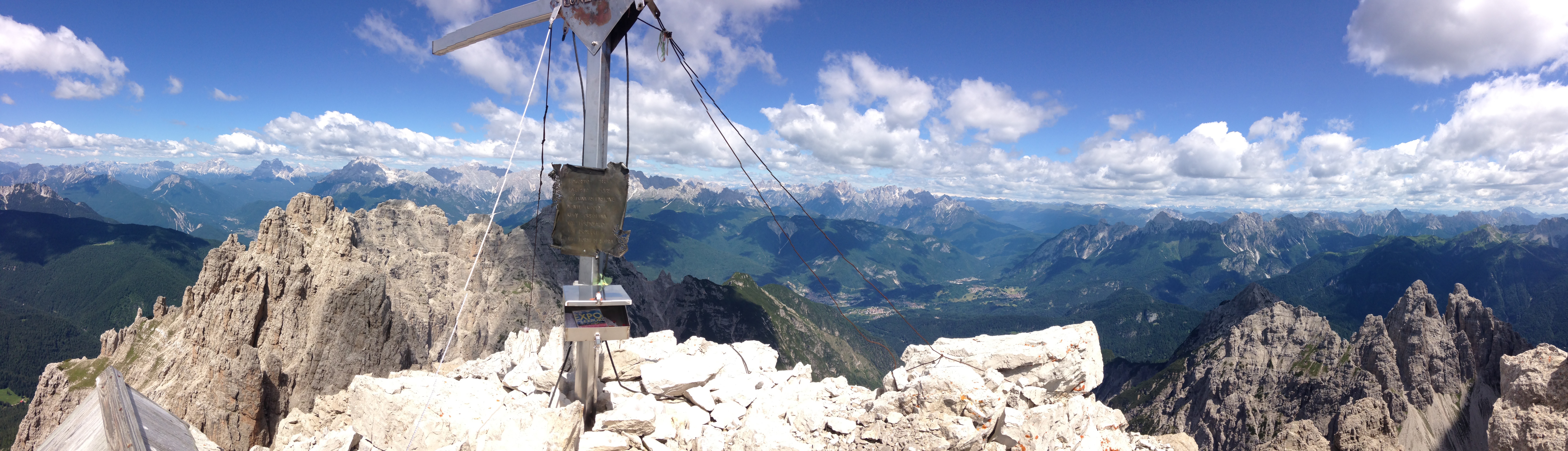 Siamo in cima, la vediamo, non la croce, ma sappiamo che mancheranno 100 metri al traguardo, peró ci si presenta un passaggio difficile, forse il piú difficile: un salto di 3 metri circa, dove bisogna aggirare questo sperone di roccia esposto nel vuoto, riflettiamo. Eravamo stanchetti, avevamo spinto forte fino a li (adesso ve lo dico, qui eravamo a 2 ore giuste), ci mancava un filino di luciditá anche se entrambi stavamo benissimo, decidiamo di tornare indietro, forse anche per poter dire: “siamo tornati indietro” a nostra giustificazione, peró forse, insomma ci sembrava la cosa giusta da fare. Facciamo 20 metri in discesa e ci fermiamo per farci un bel selfie con la GoPro nel punto raggiunto, quando sentiamo una voce che ci dice: “cosa state facendo, starete mica tornando indietro? Ormai siete arrivati!” Era l’ultra atleta che ci aveva visto salire, era arrivato in cima, e stava tornando indietro, gli spieghiamo la situazione e ci assicura che quel passaggio che ci faceva paura non era nulla di speciale, avevamo giá fatto di peggio fino a adesso, ma forse la stanchezza gioca brutti scherzi ogni tanto. Questo signore sulla quarantina di Vigo di Cadore ci prende (quasi) letteralemente per mano e ci fa superare questo sperone, da li in 10 minuti siamo alla croce e sulla tanto agognata cima.