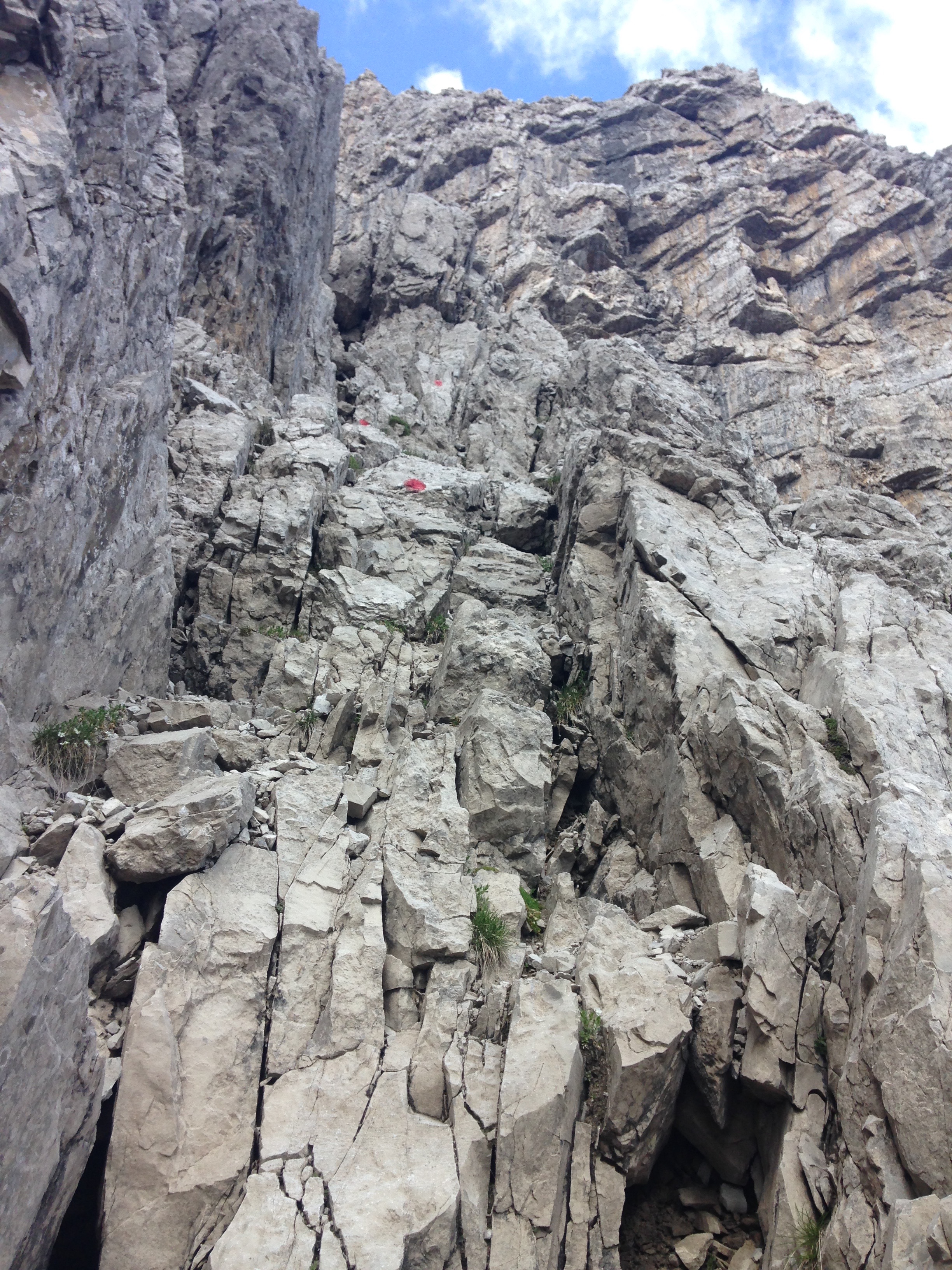 Da qui in poi la difficoltá sinceramente é abbastanza costante, non semplice, ma costante. Il nostro ritmo cala decisamente e stiamo molto attenti a dove mettiamo piedi e mani. La nostra preoccupazione principale iniziava a diventare il ritorno. Si sale fra canalini, guglie, si vedono cose pazzesche che sembrano irreali, tipo il masso di Willy il coyote che aspetta che passi Bip Bip sotto. Ci fermiamo un paio di volte per bere e per fare qualche foto con la GoPro, in una di queste pause ci supera un ultra atleta che saliva praticamente di corsa con al seguito solo 2 borracce, mostro. Tutta la via é segnata davvero benissimo, i bollini rossi sono ovunque e sbagliare é davvero molto difficile prestando attenzione, ogni tanto sembra addirittura che ti stiano indicando dove appoggiare i piedi.