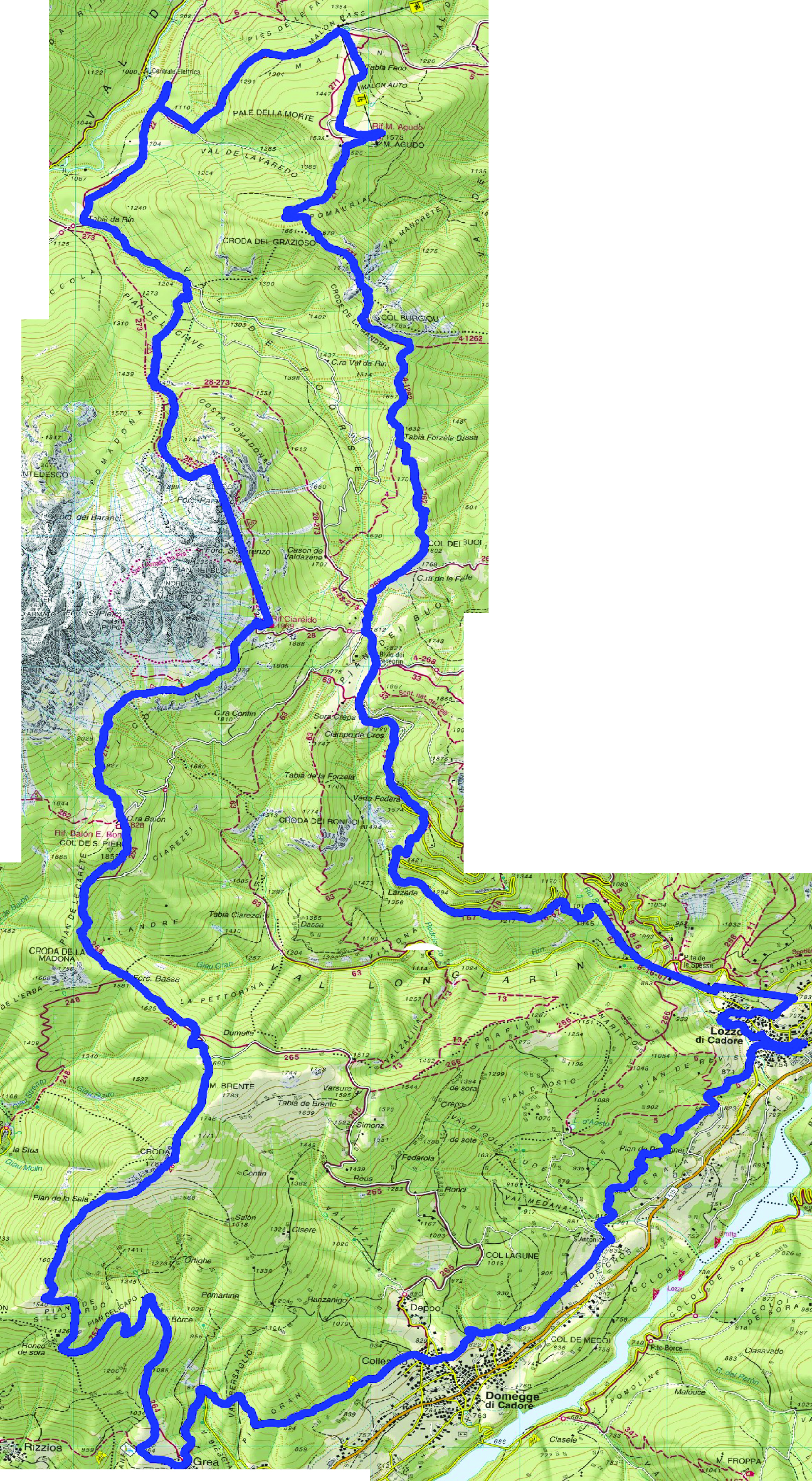 Si parte dalla piazza IV novembre di Lozzo di Cadore; dopo aver percorso la “riva delle vace” (sentiero n°5) ci si trova a correre sulla bellissima “traversata del Cadore” verso il paese di Grea di Cadore.